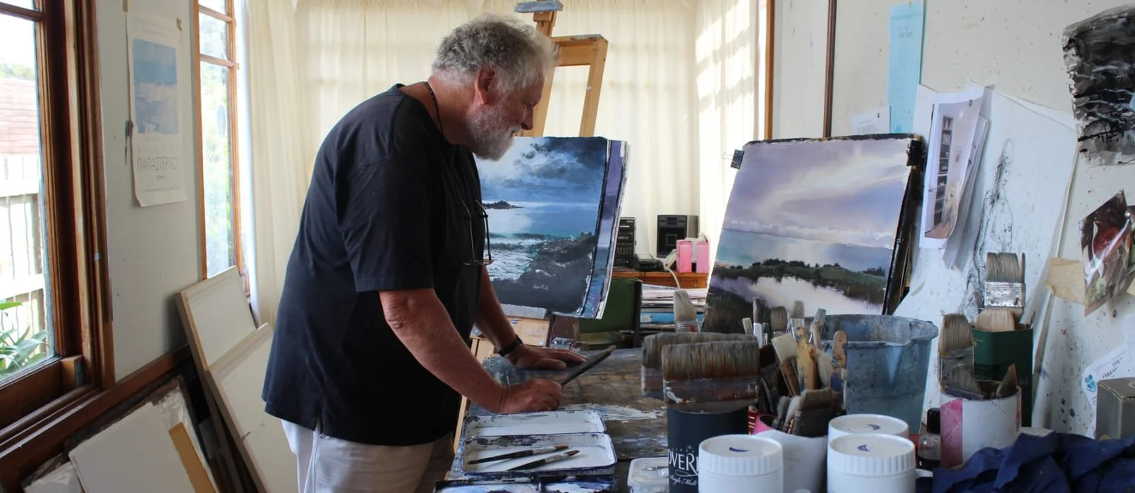 Today, Roger Murphy paints in watercolours, acrylics and gouache at his home studio at Kingston Beach, Tasmania. It's a beach cottage he and Jan bought in 1967, right after the bushfires.